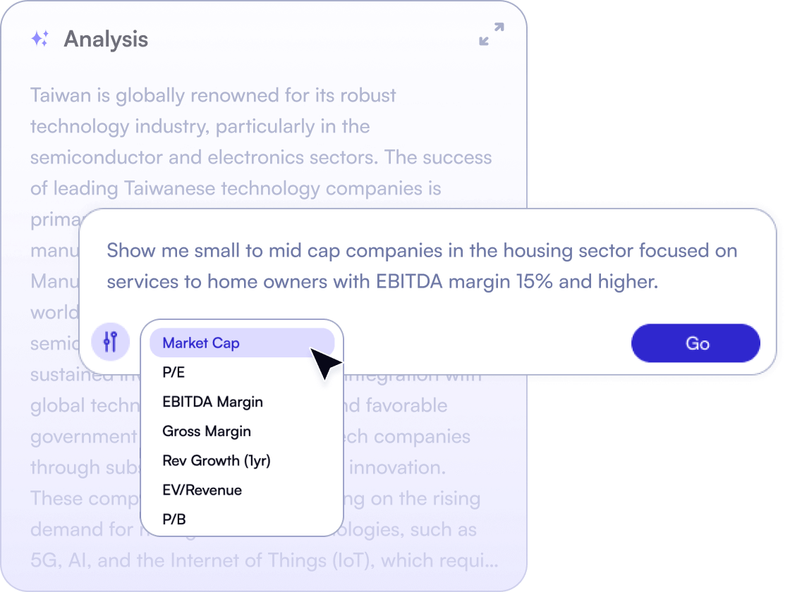 Easily create your universe and find the companies you're looking for. No more searching through menus, turning knobs and dials – just type or say what you're looking for.