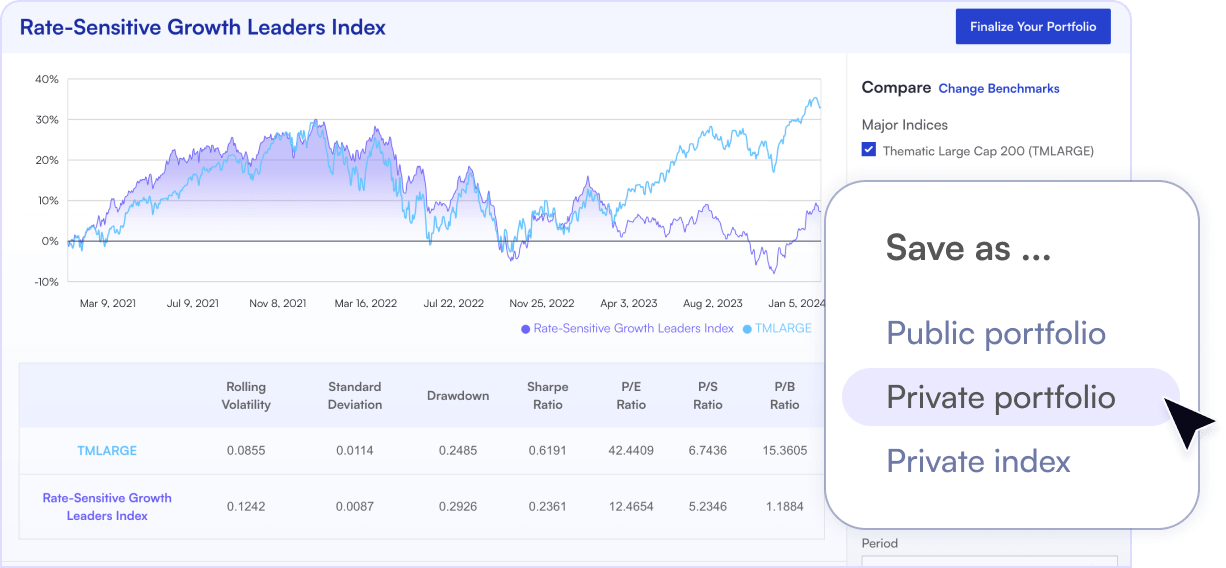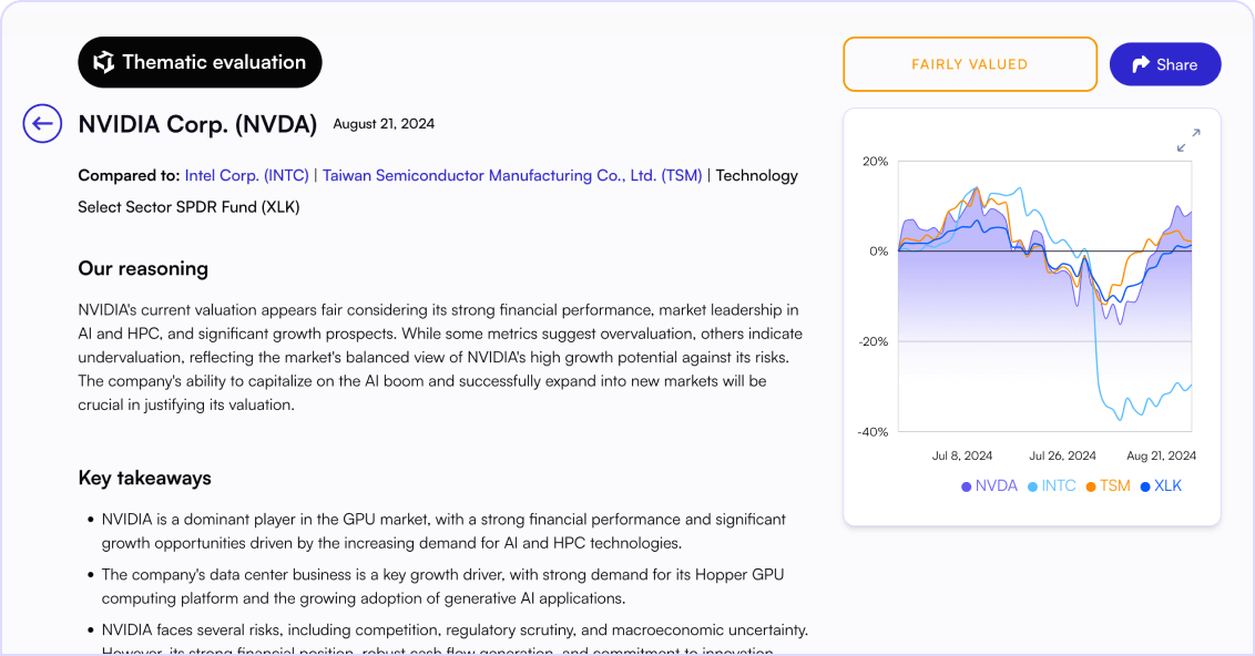 Add the power of Thematic's institutional-quality, AI-enabled company valuations and asset management product development capabilities to your workflow.