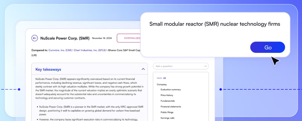 Get months of insights in minutes utilizing our multi-LLM platform, institutional financial data, and real-time backtesting and benchmarking capabilities.