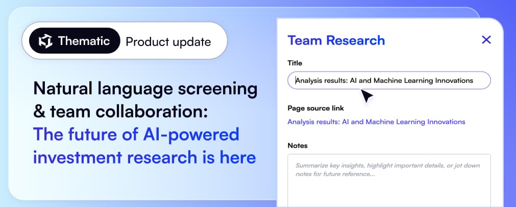 By combining generative AI, hundreds of thousands of company documents, and years of financial data, Thematic helps investment professionals quickly develop a point of view on investment decisions and also create new marketable investment products.