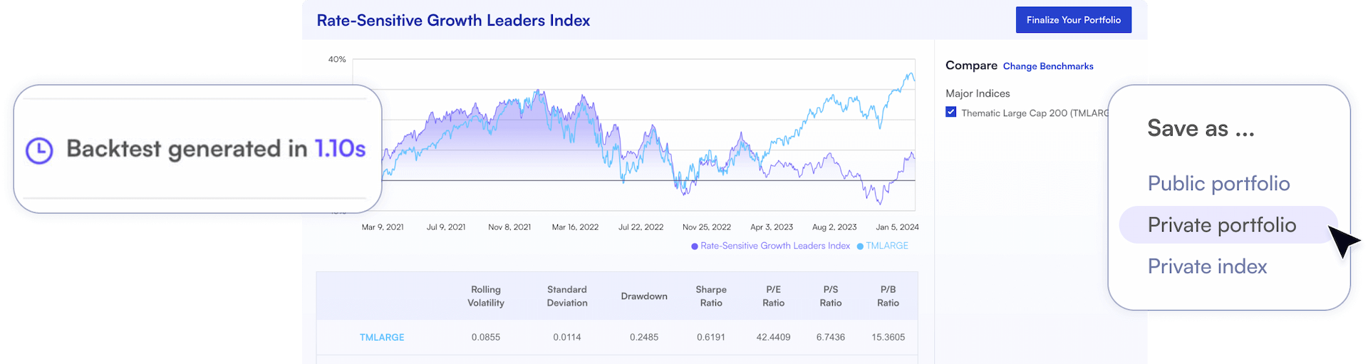 Instantly build model portfolios and pressure test with experiments. Gain insights through instantly calculated portfolio metrics. Run backtests over multiple years and situations in seconds. Track the portfolios over time and look for signals.