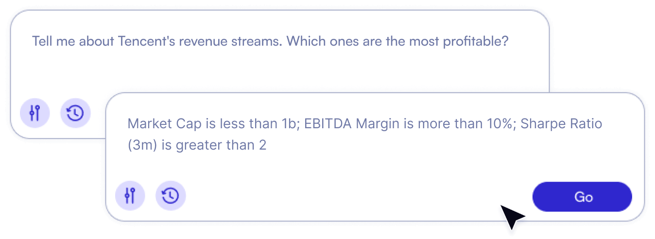 Easily create your universe and find the companies you're looking for. No more searching through menus, turning knobs and dials – just type or say what you're looking for.